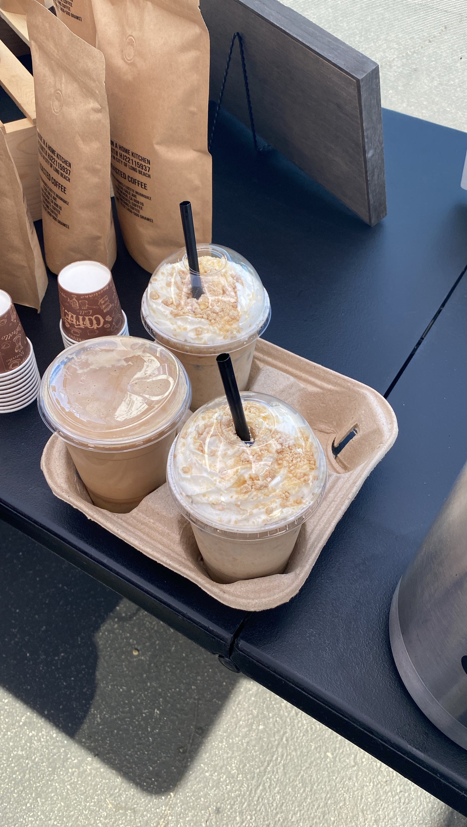 We have a variety of coffee drinks available at our pop up locations. We not only offer whole bean roasted coffee. We also offer iced lattes, and hot drip coffee.